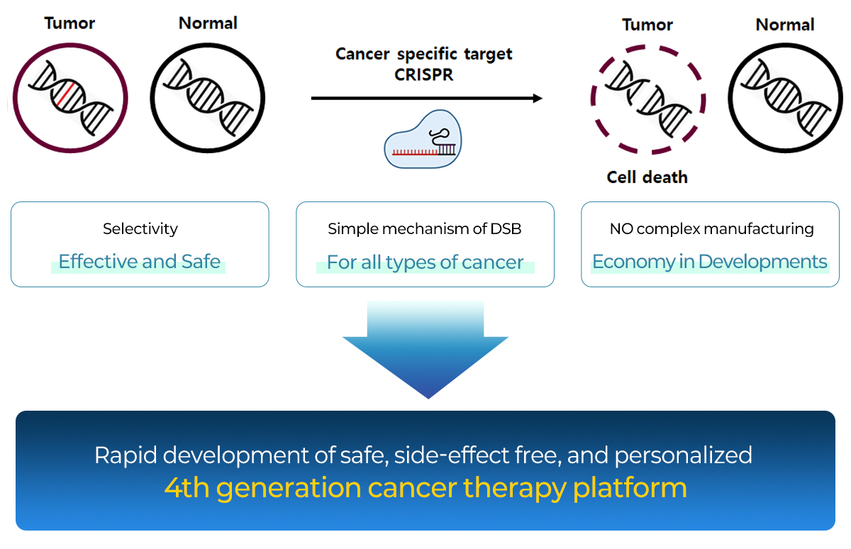 Our company is developing a CRISPR-based therapy that accurately recognizes and cuts the In/Del mutation sites found only in cancer cells, thereby selectively destroying cancer cells.